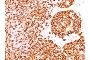 CD45R, also designated CD45 and PTPRC, has been identified as a transmembrane glycoprotein, broadly expressed among hematopoietic cells. Multiple isoforms of CD45R are distributed throughout the immune system according to cell type. These isoforms arise because of alternative splicing of exons 4, 5, and 6. The corresponding protein domains are characterized by the binding of monoclonal antibodies specific for CD45RA (exon 4), CD45RB (exon 5), CD45RC (exon 6) and CD45RO (exons 4 to 6 spliced out). The variation in these isoforms is localized to the extracellular domain of CD45R, while the intracellular domain is conserved. CD45RB is expressed on mature B-lymphocytes and the majority of lymphomas and leukemias of B-cell origin. This antigen is also expressed on the surface of cells of myeloid lineage.