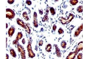 1. Staining of formalin-fixed tissues requires boiling tissue sections in 10 mM Citrate buffer, pH 6.0, for 10-20 min followed by cooling at RT for 20 min.