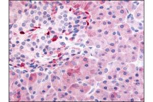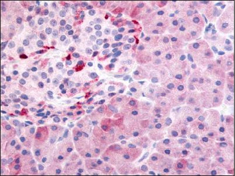 Immunohistochemistry on paraffin sections (10 μg/mL). Antigen retrieval: Steam slides in 0.01 M sodium citrate buffer, pH 6.0, at 99-100C for 20 min. Remove from heat and let stand at room temperature in buffer for 20 min. Rinse in 1xTBS with Tween (TBST) for 1 min. at room temperature.