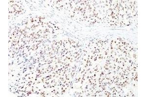 MITF (microphthalmia transcription factor) is a basic helix-loop-helix-leucine-zipper (bHLH-Zip) transcription factor that regulates the development and survival of melanocytes and retinal pigment epithelium, and also is involved in transcription of pigmentation enzyme genes such as tyrosinase TRP1 and TRP2. MITF has been shown to be phosphorylated by MAP kinase in response to c-kit activation, resulting in upregulation of MITF transcriptional activity. Mutations of the MITF gene are associated with the autosomal dominant hereditary deafness and pigmentation condition, Waardenburg Syndrome type 2A. Multiple isoforms of MITF exist, including MITF-A, MITF-B, MITF-C, MITF-H, and MITF-M, which differ in the amino-terminal domain and in their expression patterns. The MITF-M isoform is restricted to the melanocyte cell lineage. Anti-MITF, D5, recognizes a nuclear protein, which is expressed in the majority of primary and metastatic epithelioid malignant melanomas as well as in normal melanocytes, benign nevi and dysplastic nevi.