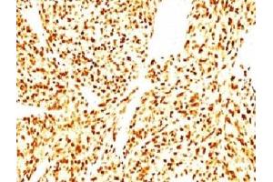 - Recognizes a phosphor-protein of 45 kDa, identified as MyoD1. It does not cross react with myogenin, Myf5, or Myf6. Antibody to MyoD1 labels the nuclei of myoblasts in developing muscle tissues. MyoD1 is not detected in normal adult tissue, but is highly expressed in the tumor cell nuclei of rhabdomyosarcomas. Occasionally nuclear expression of MyoD1 is seen in ectomesenchymoma and a subset of Wilms tumors. Weak cytoplasmic staining is observed in several non-muscle tissues, including glandular epithelium and also in rhabdomyosarcomas, neuroblastomas, Ewings sarcomas and alveolar soft part sarcomas.