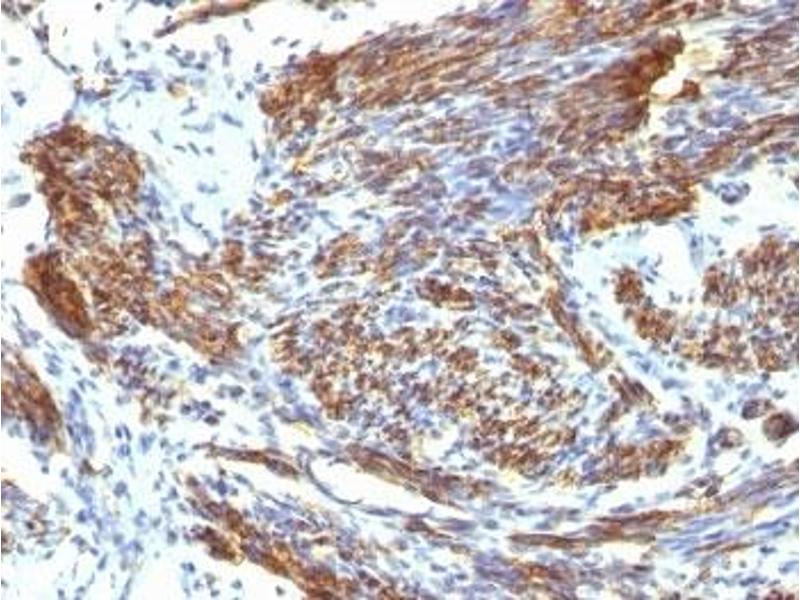 - Recognizes a protein of 150 kDa, which is identified as the high molecular weight variant of Caldesmon. Two closely related variants of human caldesmon have been identified which are different in their electrophoretic mobility and cellular distribution. The h-caldesmon variant (120-150 kDa) is predominantly expressed in smooth muscle whereas l-caldesmon (70-80 kDa) is found in non- muscle tissue and cells. Neither of the two variants has been detected in skeletal muscle. This mAb recognizes only the 150 kDa variant (h-caldesmon) in Western blots of human aortic media extracts and is unreactive with fibroblast extracts from cultivated human foreskin. Caldesmon is a developmentally regulated protein involved in smooth muscle and non-muscle contraction.