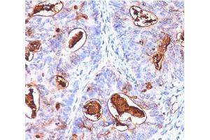 - This antibody cocktail recognizes proteins of 80-200 kDa, identified as different members of the CEA (Carcinoembryonic Antigen) family. CEA is synthesized during development in the fetal gut and is re-expressed in increased amounts in intestinal carcinomas and several other tumors. This antibody does not react with nonspecific cross-reacting antigen (NCA) and with human polymorphonuclear leucocytes. The antibody cocktail shows no reaction with a variety of normal tissues and is suitable for staining of formalin/paraffin tissues. CEA is not found in benign glands, stroma, or malignant prostatic cells. antibody to CEA is useful in detecting early foci of gastric carcinoma and in distinguishing pulmonary adenocarcinomas (60-70 % are CEA+) from pleural mesotheliomas (rarely or weakly CEA+). CEA antibody positivity is seen in adenocarcinomas from the lung, colon, stomach, esophagus, pancreas, gallbadder, urachus, salivary gland, ovary, and endocervix.