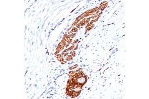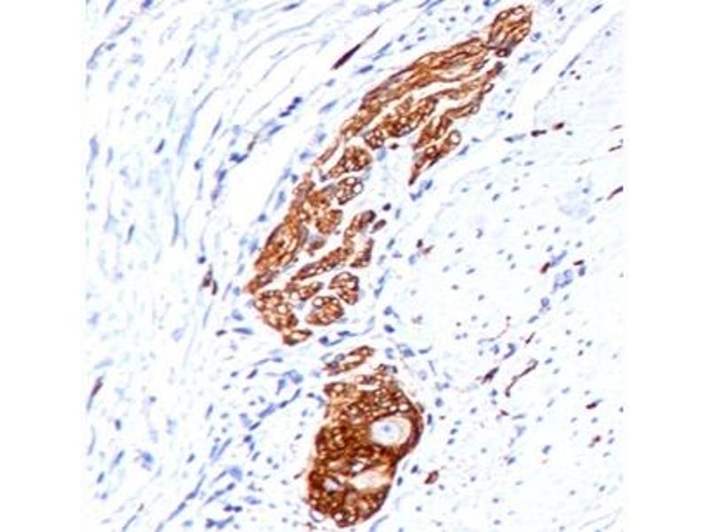 1. Staining of formalin-fixed tissues requires boiling tissue sections in 10 mM Citrate Buffer, pH 6.0, for 10-20 min followed by cooling at RT for 20 minutes.