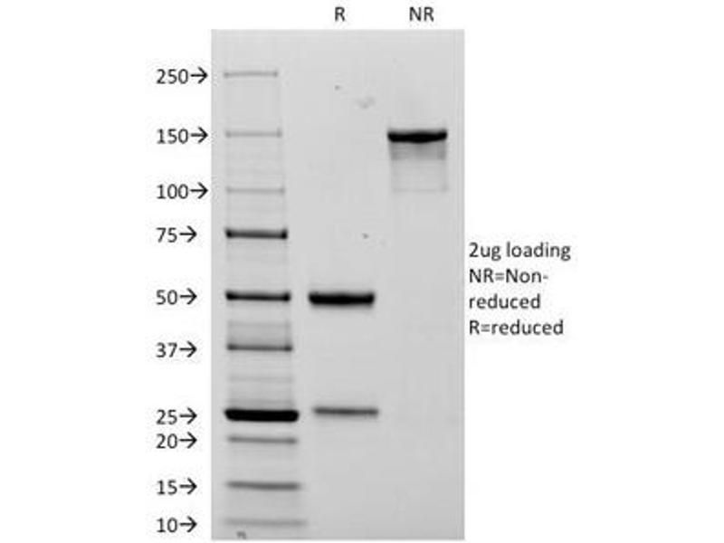 2. The prediluted format is supplied in a dropper bottle and is optimized for use in IHC. After epitope retrieval step (if required), drip mAb solution onto the tissue section and incubate at RT for 30 min.\. Western blot: 0.5-1 μg/mL, FACS: 0.5-1 μg/million cells,IF: 1-2 μg/mL,IHC (FFPE): 0.5-1 μg/mL for 30 minutes at RT (1),Prediluted format : incubate for 30 min at RT (2) -