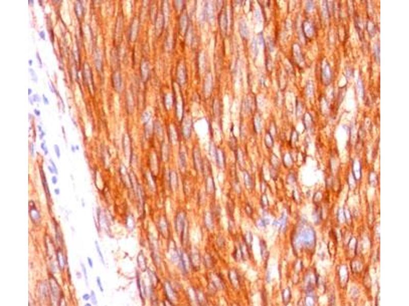 This antibody recognizes a protein of 145 kDa, identified as CD117, or p145kit. It is found on a wide variety of tumor cells including follicular and papillary carcinoma of thyroid, adenocarcinomas from endometrium, lung, ovary, pancreas, and breast as well as malignant melanoma, endodermal sinus tumor, and small cell carcinoma. However, CD117 antibody has been particularly useful in differentiating gastrointestinal stromal tumors from Kaposi's sarcoma, tumors of smooth muscle origin, fibromatosis, and neural tumors of the GI tract. CD117 antibody is also useful in recognizing myeloblasts in bone marrow biopsy and clot section.