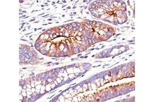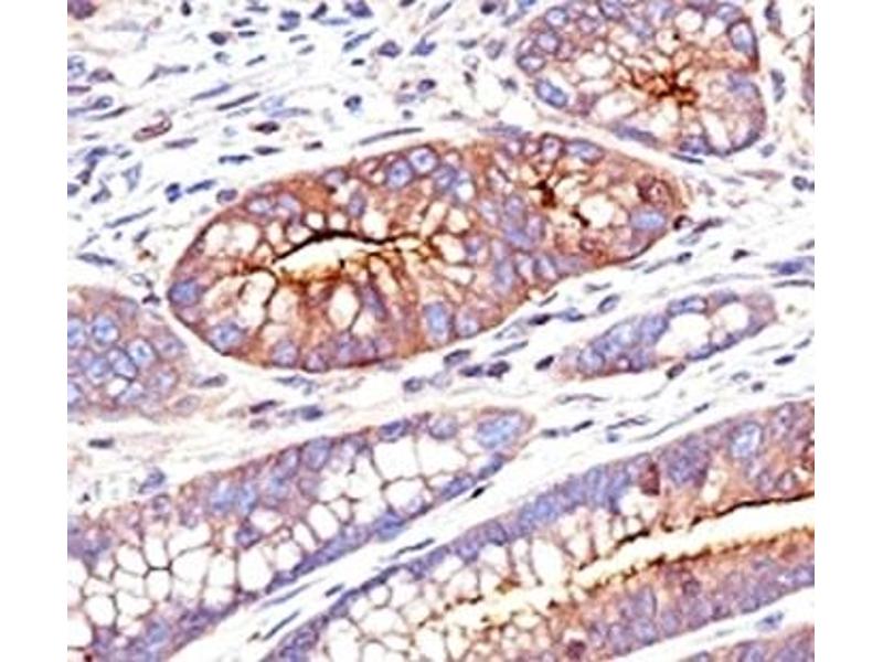 - This antibody recognizes proteins of 80-200 kDa, identified as different members of CEA family. CEA is synthesized during development in the fetal gut and is re-expressed in increased amounts in intestinal carcinomas and several other tumors. This mAb does not react with nonspecific cross-reacting antigen (NCA) and with human polymorphonuclear leucocytes. It shows no reaction with a variety of normal tissues and is suitable for staining of formalin/paraffin tissues. CEA is not found in benign glands, stroma, or malignant prostatic cells. Antibody to CEA is useful in detecting early foci of gastric carcinoma and in distinguishing pulmonary adenocarcinomas (60-70 % are CEA+) from pleural mesotheliomas (rarely or weakly CEA+). Anti-CEA positivity is seen in adenocarcinomas from the lung, colon, stomach, esophagus, pancreas, gallbadder, urachus, salivary gland, ovary, and endocervix.
