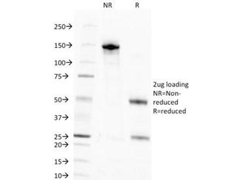 2. The prediluted format is supplied in a dropper bottle and is optimized for use in IHC. After epitope retrieval step (if required), drip mAb solution onto the tissue section and incubate at RT for 30 min.\. Flow Cytometry: 0.5-1 μg/million cells in 0.1ml,Immunofluorescence: 0.5-1 μg/mL,Immunocytochemistry (Acetone-fixed): 0.25-0.5 μg/mL for 30 min at RT,Immunohistochemistry (FFPE): 0.25-0.5 μg/mL for 30 min at RT (1),Prediluted format: incubate for 30 min at RT (2) -