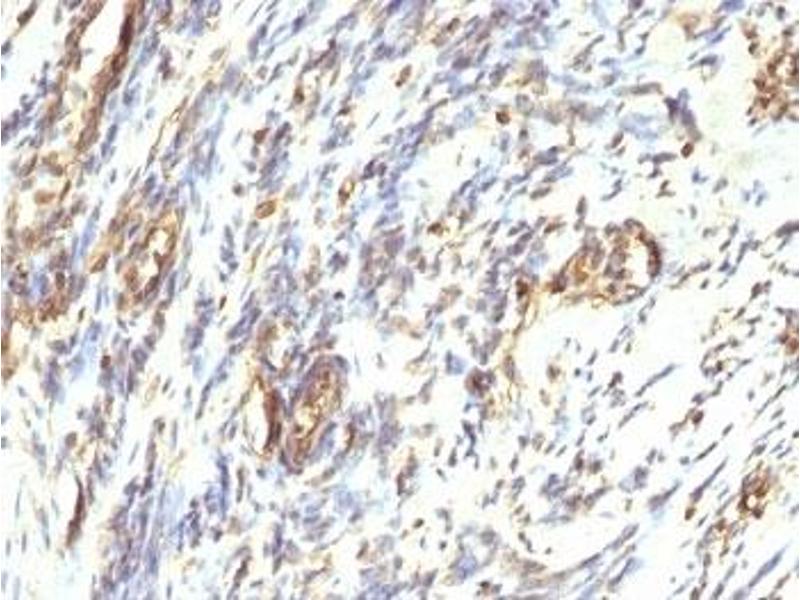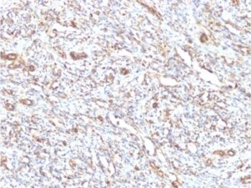 This mAb reacts with a 58 kDa protein identified as vimentin. It shows no cross-reaction with other closely related intermediate filament proteins (IFPs) such as desmin, keratin, neurofilament, and glial fibrillary acid protein. Anti-vimentin alone is of limited value as a diagnostic tool, however, when used in panels with other antibodies, it is useful for the sub-classification of a given tumor. Expression of vimentin, when used in conjunction with anti-keratin, is helpful when distinguishing melanomas from undifferentiated carcinomas and large cell lymphomas. All melanomas and Schwannomas react strongly with anti-vimentin. It labels a variety of mesenchymal cells, including melanocytes, lymphocytes, endothelial cells, and fibroblasts. Non-reactivity of anti-vimentin is often considered more useful than its positive reactivity, since there are a few tumors that do not contain vimentin, e.g. hepatoma and seminoma. Anti-vimentin is also useful as a tissue process control reagent.