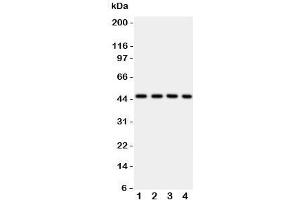 The stated application concentrations are suggested starting amounts. Titration of the PDK2 antibody may be required due to differences in protocols and secondary/substrate sensitivity.\. Western blot: 0.5-1 μg/mL,IHC (Paraffin): 0.5-1 μg/mL,Immunocytochemistry: 0.5-1 μg/mL
