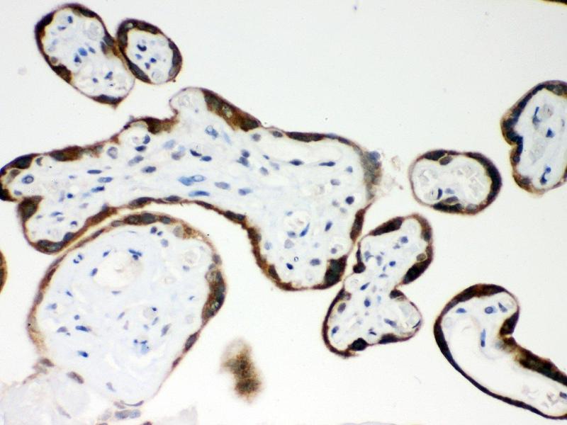 Tissue Specificity: High levels in placenta and pregnancy serum. In placenta, expressed in X cells in septa and anchoring villi, and in syncytiotrophoblasts in the chorionic villi. Lower levels are found in a variety of other tissues including kidney, myometrium, endometrium, ovaries, breast, prostate, bone marrow, colon, fibroblasts and osteoblasts. .