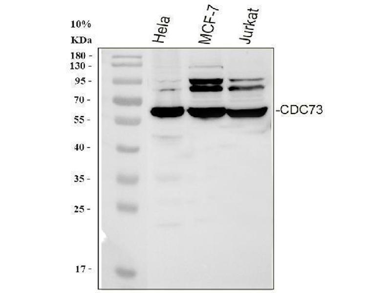 Background: Cell division cycle 73, also known as HRPT2, is a protein which in humans is encoded by the CDC73 gene. This gene encodes a tumor suppressor that is involved in transcriptional and post-transcriptional control pathways. The protein is a component of the the PAF protein complex, which associates with the RNA polymerase II subunit POLR2A and with a histone methyltransferase complex. And this protein appears to facilitate the association of 3' mRNA processing factors with actively-transcribed chromatin. Mutations in this gene have been linked to hyperparathyroidism-jaw tumor syndrome, familial isolated hyperparathyroidism, and parathyroid carcinoma.