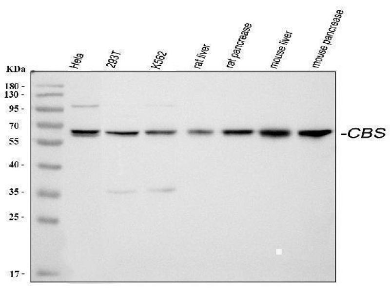 - Anti-Cystathionine beta-synthase CBS Antibody (ABIN3043747). Tested in IHC, WB applications. This antibody reacts with Human, Mouse, Rat. This is a premium antibody that guarantees superior quality, high affinity, and strong signals with minimal background in Western blot applications.