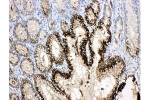 Tissue Specificity: Found in stomach, with highest levels in the upper gastric mucosal cells (at protein level). Detected in goblet cells of the small and large intestine and rectum, small submucosal glands in the esophagus, mucous acini of the sublingual gland, submucosal glands of the trachea, and epithelial cells lining the exocrine pancreatic ducts but not in the remainder of the pancreas (at protein level). Scattered expression is detected in the epithelial cells of the gallbladder and submucosal glands of the vagina, and weak expression is observed in the bronchial goblet cells of the pseudostratified epithelia in the respiratory system (at protein level). Detected in urine (at protein level). Strongly expressed in breast cancer but at low levels in normal mammary tissue. It is regulated by estrogen in MCF-7 cells. Strong expression found in normal gastric mucosa and in the regenerative tissues surrounding ulcerous lesions of gastrointestinal tract, but lower expression found in gastric cancer (at protein level). .