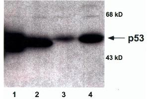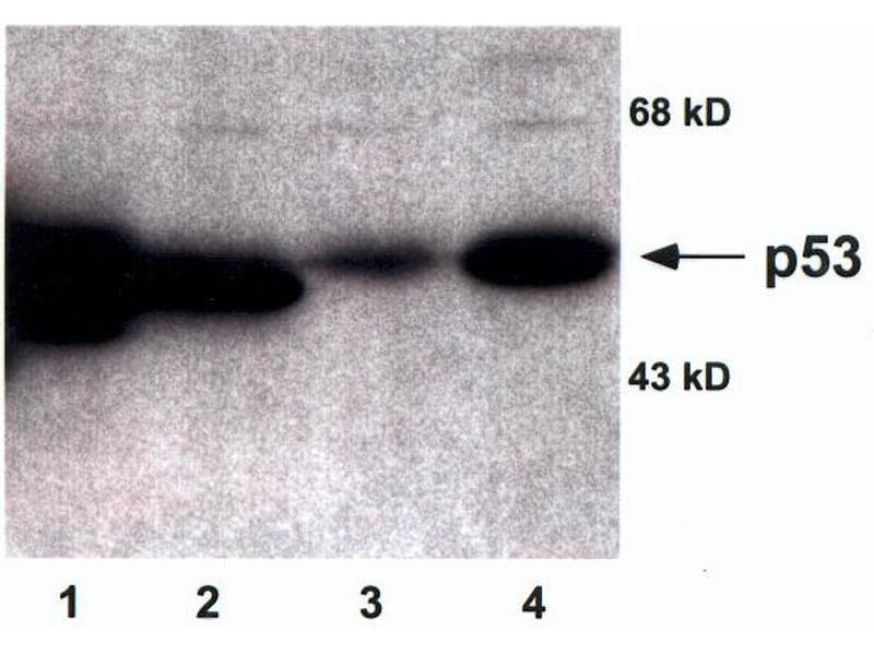 - GST p53 fusion protein containing amino acids 1-393 of human p53was used as immunogen. p53 has a molecular weight of 53kDa p53 is a transcription factor that can inhibit cell cycle progression or induce apoptosis in response to stress or DNA damage. Disruption of the p53 signalling pathway through various mechanisms is the most common alteration in human cancer occuring in over half of all tumors. The p53 protein is short lived and expressed at low levels in normal cells but accumulates and/or is activated in cells that have undergone genotoxic damage or oncogene activation. Many tumor derived and transformed cell lines express elevated levels of mutant p53 protein. Synonyms: Sheep anti human p53, hp53.