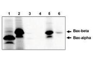 - Apoptosis regulator Bax cytoplasmic isoform beta , BaxB, BAX, BCL2 associated X protein, Apoptosis regulator BAX, BCL2 associated X protein isoform beta, Bax beta, Bax B,Bax is encoded by a 1.5 kb RNA species created by the retention of intron 5 in the bax mRNA transcript. The exon4/intron5 splice junction is evolutionarily conserved and is found in both the human and mouse bax coding regions. The 630 bp intron 5 contributes 60 amino acids to the Bax protein before a stop codon is encountered during translation. The Bax protein is 24 kDa in size and although it contains the BH1, BH2, and BH3 domains identical to Bax, it has a unique carboxyl terminus and does not have a hydrophobic transmembrane domain (Oltvai et al., 1993). Bax mRNA has been found in many mouse tissues using RT-PCR. It is found co-expressed with Bax in lung, stomach, kidney, thymus, lymph node, bone marrow, pancreas, and spleen. Bax mRNA was very abundant in brain and duodenum with almost no Bax mRNA detected in these tissues (Oltvai et al., 1993).