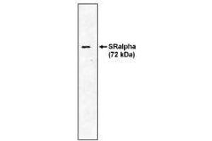 Signal Recognition Particle Receptor, α subunit,The receptor for Signal Recognition Particle (SRP) is the site on the endoplasmic reticulum that ribosomes translating secreted and integral membrane proteins are initially targeted to. Once the ribosome-SRP complex arrives at the SRP receptor the protein being translated is transferred to the translocation complex (Sec61) in the ER membrane. The SRP receptor is composed of two subunits SRalpha and SRbeta. The SRalpha subunit is a translocation GTPase peripherally bound to the endoplasmic reticulum by its interaction with SRbeta. SRalpha also binds to the GTPase of SRP (SRP54) and these two proteins appear to function as each others GTPase activating proteins (GAPs). Hydrolysis of GTP by SRalpha and SRP54 is thought to be involved in transfer of the nascent protein to the Sec61 complex in the ER. SRalpha has an apparent molecular weight of 72 kDa. SRbeta is a Type I transmembrane protein that spans the membrane once and contains Ras type GTPase domain. The function of the GTPase in SRbeta is unknown. The membrane spanning domain is at the amino-terminus of SRbeta. The GTPase domain encompasses three quarters of the protein and is carboxyl- of the transmembrane region. SRalpha binds to the GTPase domain of SRbeta. Heterodimerization of SRalpha and SRbeta masks the carboxyl-terminal epitope of SRbeta.