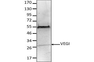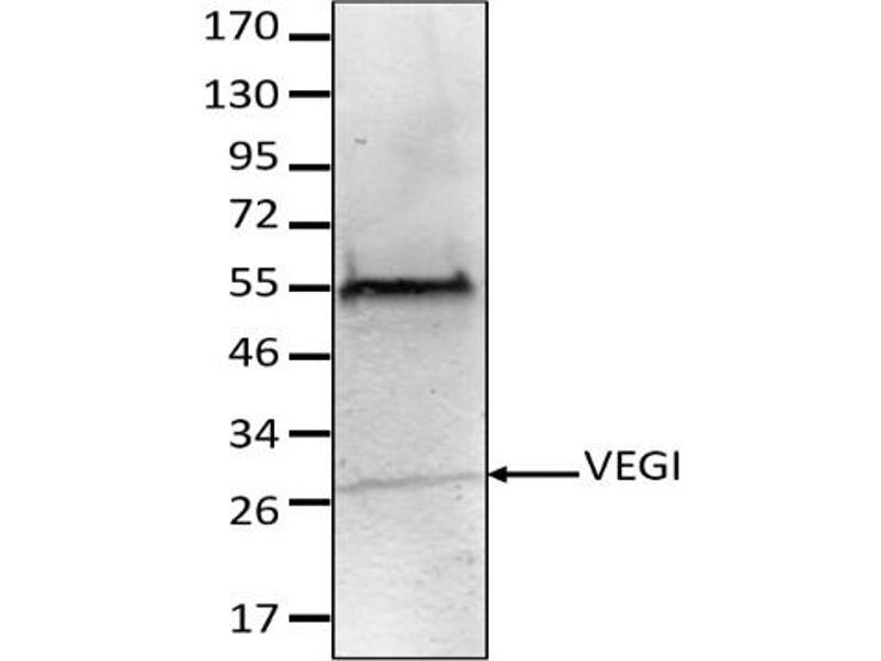 Vascular endothelial cell growth inhibitor (VEGI), a member of the tumor necrosis factor (TNF) family, is an endothelial cell-specific inhibitor of angiogenesis. Overexpression of a secretable VEGI fusion protein by cancer cells resulted in abrogation of xenograft tumor progression. 4-3H8B is a mouse monoclonal IgG1 raised against a recombinant VEGI isoform which shares a C-terminal 151-residue segment with previously reported VEGI with 174 residues.