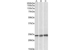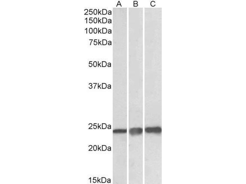 Western Blot: Approx 24 kDa band observed in lysates of cell line HEK293, A431 and HepG2 (calculated MW of 22.1 kDa according to NP_859048.1). Recommended concentration: 0.1-0.3 μg/mL.