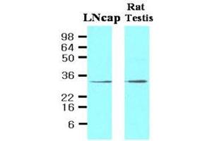 ELISA. Western blot (cell lysates of LNcap (30 μg) and Rat testis (30 μg) were resolved bySDS-PAGE, transferred to NC membrane and probed with anti-human STEAP1 (1: 500). Proteins were visualized using a goat anti-mouse secondary antibody conjugated to HRPand an ECL detection system). Immunofluorescence (1: 100 - 1: 300). Immunohistochemsitry on paraffin sections (1: 50 - 1: 100). Other applications not tested. Optimal dilutions are dependent on conditions and should be determined by the user.