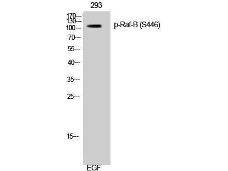 Phospho-Raf-B (S446) Polyclonal Antibody detects endogenous levels of Raf-B protein only when phosphorylated at S446.