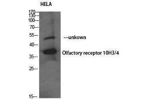 Olfactory receptor 10H3/4 Polyclonal Antibody detects endogenous levels of Olfactory receptor 10H3/4 protein.