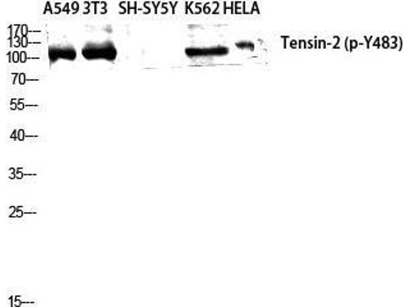 Phospho-Tensin-2 (Y483) Polyclonal Antibody detects endogenous levels of Tensin-2 protein only when phosphorylated at Y483.