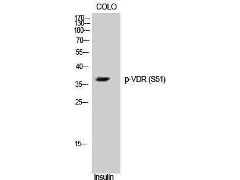 Phospho-VDR (S51) Polyclonal Antibody detects endogenous levels of VDR protein only when phosphorylated at S51.
