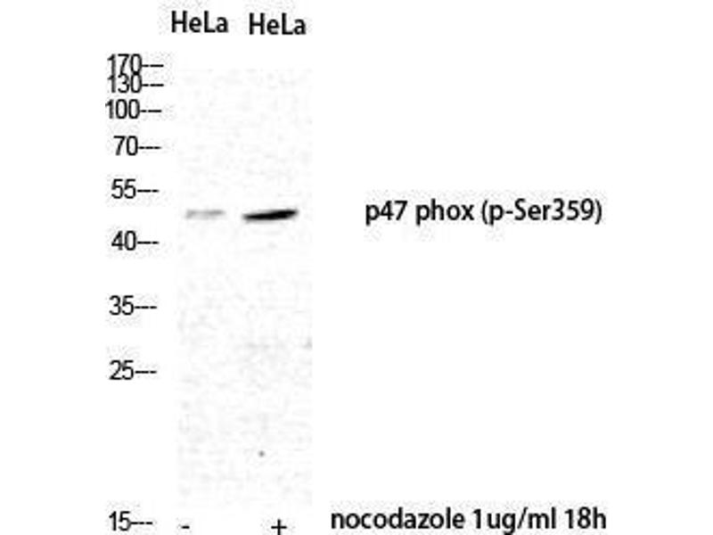 Phospho-p47-phox (S359) Polyclonal Antibody detects endogenous levels of p47-phox protein only when phosphorylated at S359.