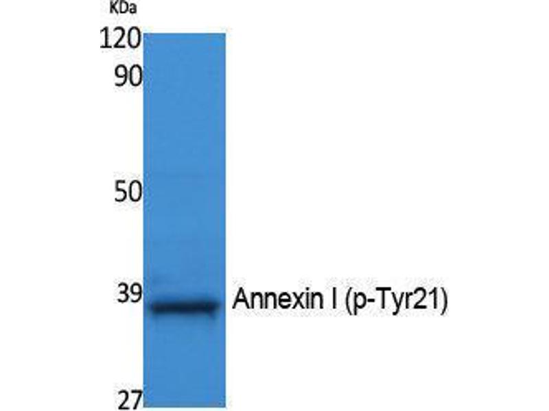 Phospho-Annexin I (Y21) Polyclonal Antibody detects endogenous levels of Annexin I protein only when phosphorylated at Y21.