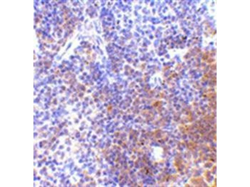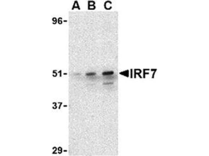 IRF7 is a 54kD transcriptional activator of type I interferons (IFNalpha/beta) in response to local and systemic viral infection. IRF7 is mostly expressed by plasmacytoid dendritic cells (pDC), which differentiate in response to IFNs and virus infection. This then stabilizes the IRF7 protein, in turn leading to increased IFN production. Multiple IRF7 transcript variants have been identified, although their individual functions have not yet been established.Synonyms: IRF-7, Interferon regulatory factor 7