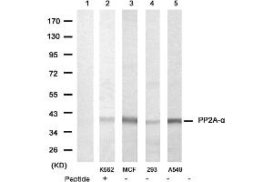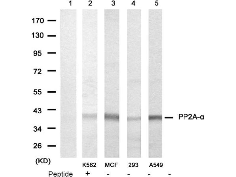 Protein phosphatase 2A (PP2A) is the most abundant phosphatase specific for serine and threonine phosphorylation in mammalian cells. Dephosphorylation of substrates targeted by PP2A plays a vital role in a large variety of cellular processes including signal transduction, regulation of the cell cycle, gene expression and development. Protein phosphatase 2 is one of the four major Ser/Thr phosphatases, and it is implicated in the negative control of cell growth and division. It consists of a common heteromeric core enzyme, which is composed of a catalytic subunit and a constant regulatory subunit, that associates with a variety of regulatory subunits. The constant regulatory subunit alpha serves as a scaffolding molecule to coordinate the assembly of the catalytic subunit and a variable regulatory beta subunit.Synonyms: PP2A-alpha, Protein Phospatase 2A, Replication protein C, Serine/threonine-protein phosphatase 2A catalytic subunit alpha isoform