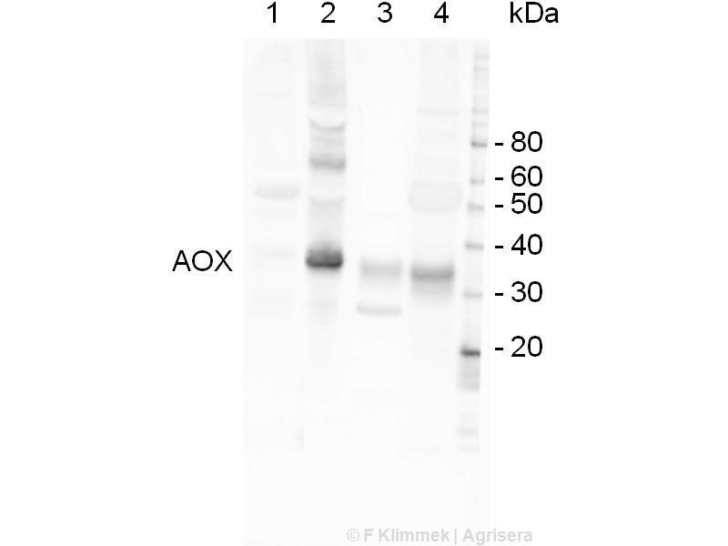 Additional information: Mitochondrion inner membrane marker. Possibly in the inner surface of the inner mitochondrial membrane.Protocol for a plant mitochondria preparation can be found here. In protein samples which are older than few months AOX enzyme can undergo intensive dimerization. Such preparations should not be used to work with this antibody.