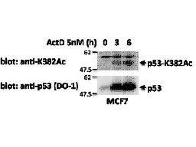 - P53 mutants are found in more than half of human cancers and are considered as the most important human cancer related gene. p53 is detected at 53kD position by electrophoresis and is composed of 393 amino acids. In the unstressed normal cells, the p53 level is low and it is inactive. However, with stress, especially with DNA damage, it is activated to promote arrest of cell cycle and repair of DNA damage, or induction of apoptosis. The functions and stability of p53 are regulated by phosphorylation of serine and threonine, and acetylation of lysine at various sites in the molecule. Acetylation of lysine 382 (acetyl-K382) of p53 occurs after DNA damage and is catalyzed by the p300/CBP acetyltransferase, which stabilizes p53 proten.