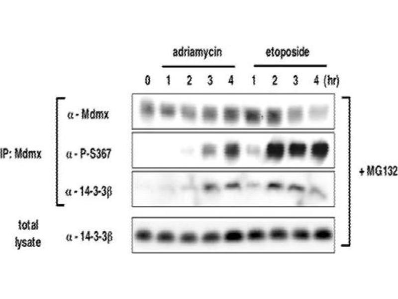 MdmX (synonyms: Mdm4, HdmX) inhibits p53-and p73-dependent cell cycle arrest and apoptosis by binding to the transcription activation domains of these proteins. MdmX consists of 490 amino acids with the molecular weight of 54,864 and contains a RIING-finger domain and a nuclear transport signal. It is known that the protein migrates aberrantly in SDS-PAGE at the position of an 80- kDa protein. MdmX is phosphorylated at Ser367 by Chk2 kinase downstream of ATM in response to DNA damage, and as a result, it binds to14-3-3 and is transported into nucleus where it is degraded by Mdm2. This process activates the p53 functions.