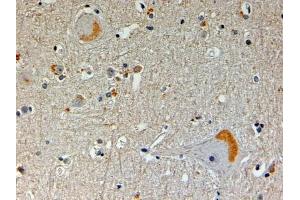 Immunohistochemistry: In paraffin embedded Human Brain shows localized cytoplasm staining in the neuronal cells. Recommended concentration, 4-6 μg/mL.