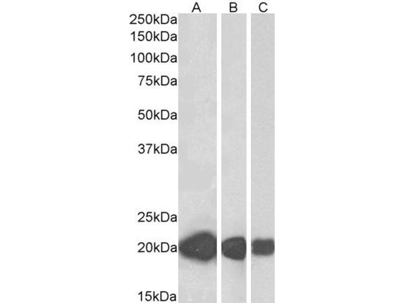 Western Blot: Approx. 20 kDa band observed in Human, Mouse and Rat Heart lysates (calculated MW of 21.0 kDa according to Human NP_003467.1 and 20.8 kDa according to Rat NP_476485.1). Recommended concentration: 0.01-0.03 μg/mL. Primary incubation was 1 hour.