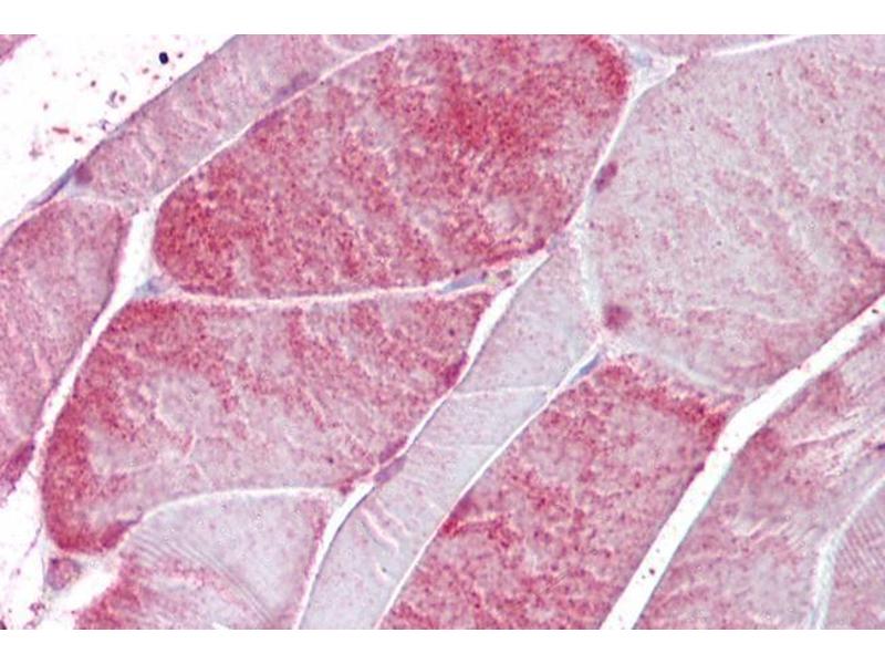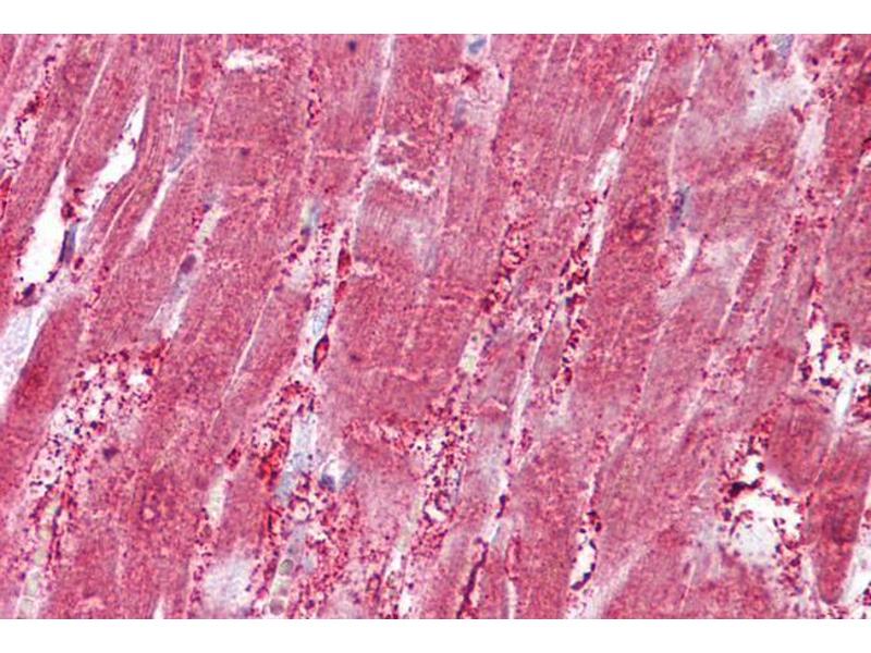 Immunohistochemistry: Paraffin embedded Human Skeletal Muscle and Heart. Recommended concentration: 2.5 μg/mL.