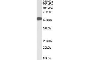 Western Blot: Approx. 55-60 kDa band observed in Human and Mouse Skeletal Muscle lysates and in Human Heart lysates (calculated MW of 53.5 kDa according to Human NP_001918.3, and Mouse NP_034173.1). Preliminary testing showed a band at approx 60 kDa in Rat