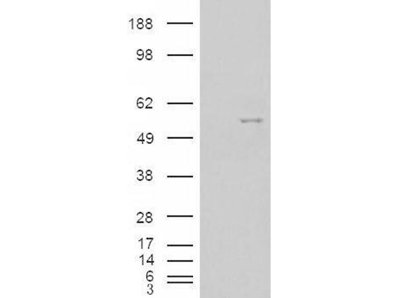 Western Blot: Approx 50-55 kDa band observed in Human Breast Cancer lysates (calculated MW of 51.7 kDa according to NP_002506.2). In transfected HEK293 transiently expressing NOVA1 a band of approx. 52 kDa is observed. This band is not observed in the non-t
