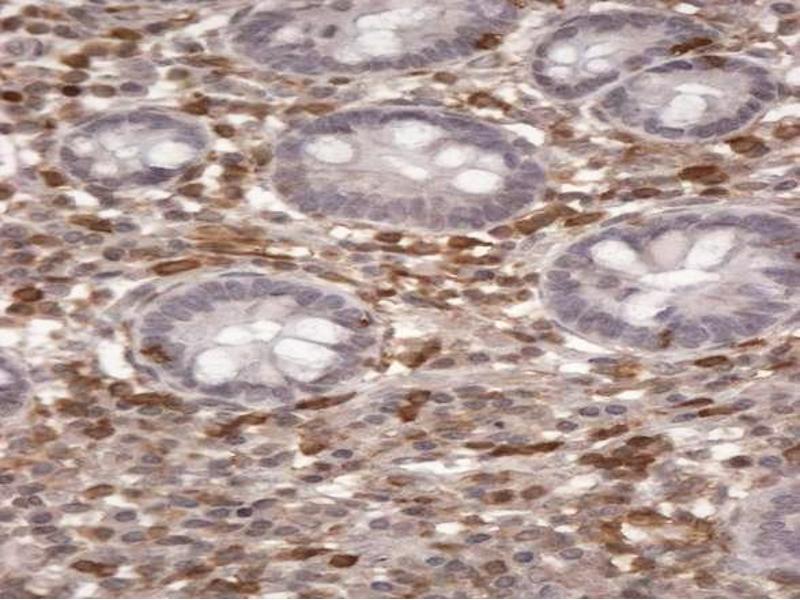 Immunohistochemistry: In paraffin embedded Human Small Intestine shows staining of lymphatic cells in the lamina propria. Recommended concentration: 1-2 μg/mL.