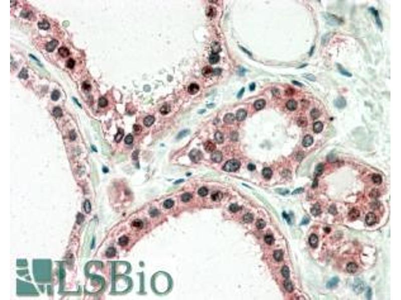 Immunohistochemistry: In paraffin embedded Thyroid Gland shows staining of cystoplasm in all epithelial cells, but nuclear staining in some of them. Recommended concentration, 5-10 μg/mL.