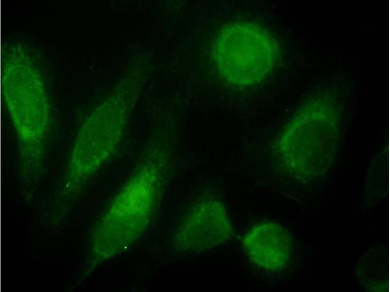Immunofluorescence: Nuclear staining (green) in HeLa cells.