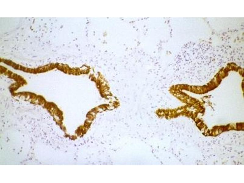 RCK102 is a cytokeratin antibody reacting with cytokeratin 5 and cytokeratin 8. This monoclonal antibody recognizes virtually all epithelial tissues and carcinomas. RCK102 is suitable for immunoblotting, immunocytochemistry, immunohistochemistry on frozen sections and paraffin-embedded tissues and flow cytometry. Optimal antibody dilution should be determined by titration, recommended range is 1:100 - 1:200 for flow cytometry, and for immunohistochemistry with avidin-biotinylated horseradish peroxidase complex (ABC) as detection reagent, and 1:100 - 1:1000 for immunoblotting applications.