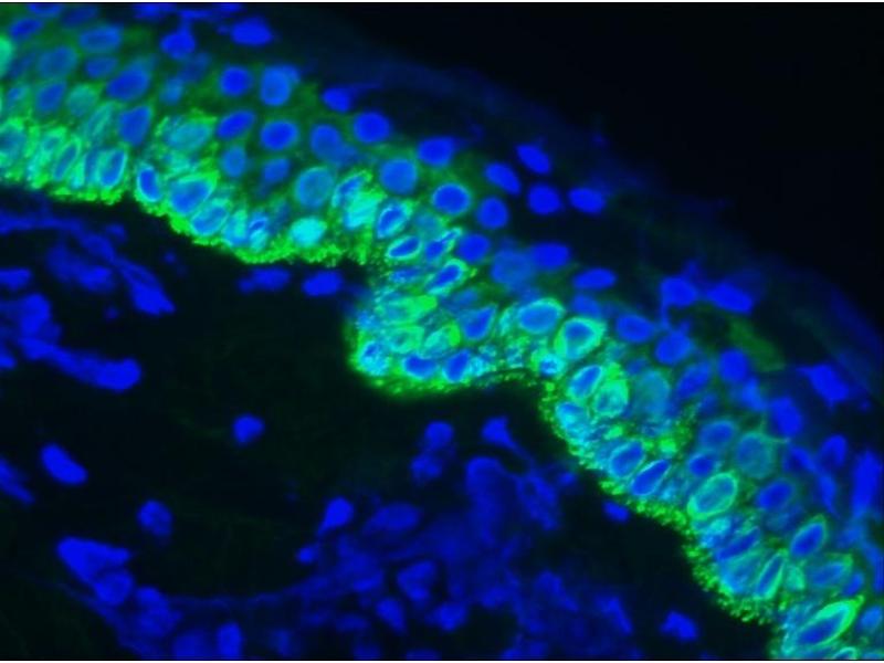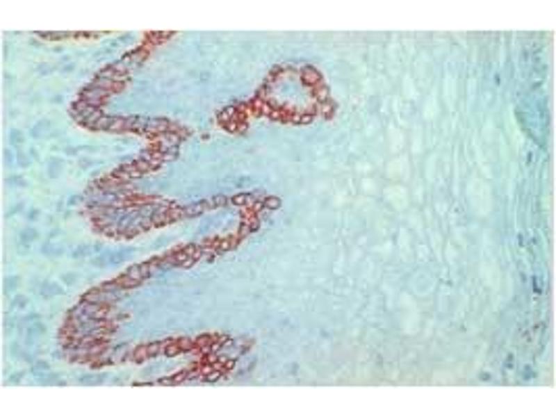 RCK107 reacts exclusively with cytokeratin 14 which is present in basal cell compartments of stratified and combined epithelia. RCK107 is suitable for immunocytochemistry, immunohistochemistry on frozen sections, flow cytometry and immunoblotting. Optimal antibody dilution should be determined by titration, recommended range is 1:100 - 1:200 for flow cytometry, and for immunohistochemistry with avidin-biotinylated horseradish peroxidase complex (ABC) as detection reagent, and 1:100 - 1:1000 for immunoblotting applications.