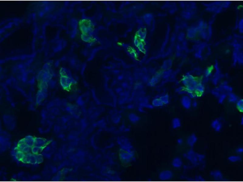 OVTL12/30 reacts exlcusively with cytokeratin 7 which is present in specific glandular-type epithelia and most carcinomas derived thereof. OVTL12/30 is effective on frozen tissue after fixation in methanol. It is particularly effective on paraffin-embedded tissue, for which pretreatment with e.g. 0.1% pronase / 0.1% trypsine in PBS or 0.5% pepsine in 0.01N HCl or microwave pretreatment is required. In addition, OVTL 12/30 is suitable for immunocytochemistry, immunoblotting and flow cytometry. Optimal antibody dilution should be determined by titration, recommended range is 1:100 - 1:200 for flow cytometry, and for immunohistochemistry with avidin-biotinylated horseradish peroxidase complex (ABC) as detection reagent, and 1:100 - 1:1000 for immunoblotting applications.