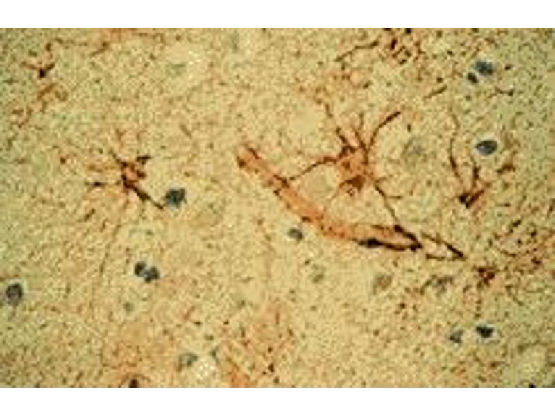 6F2 reacts exclusively with glial fibrillary acidic protein which is present in astrocytes in the central nervous system and Schwann cells. 6F2 is suitable for immunoblotting and immunohistochemistry on frozen and paraffin-embedded tissues. Optimal antibody dilution should be determined by titration, recommended range is 1:25 - 1:200 for immunohistochemistry with avidin-biotinylated horseradish peroxidase complex (ABC) as detection reagent, and 1:100 - 1:1000 for immunoblotting applications.