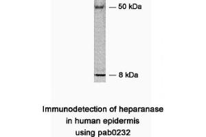 - Reacts with human 62 kDa HPSE protein, Heparanase 50 kDa subunit and Heparanase 8 kDa subunit