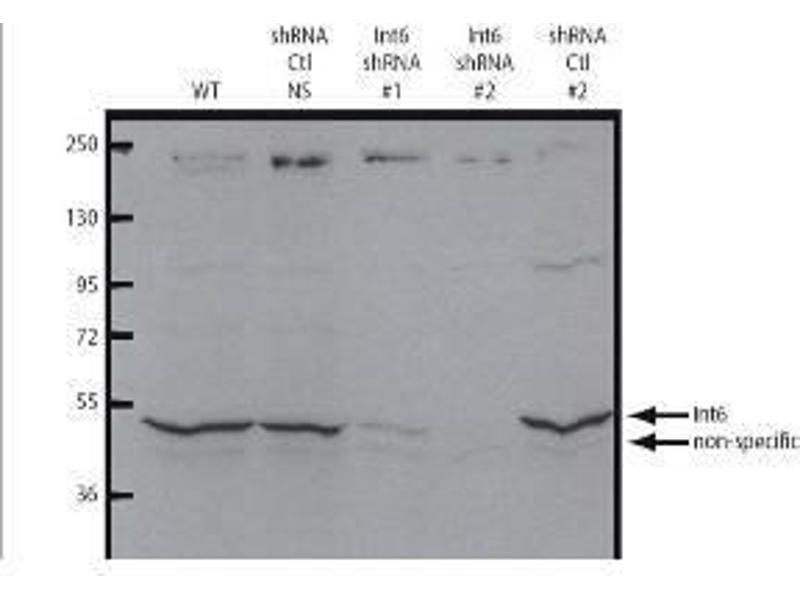 - Background: This antibody is designed, produced, and validated as part of a collaboration with the National Cancer Institute (NCI). Int6 is a candidate tumor suppressor in multiple neoplasms, and in particular, breast and lung cancers. The Int6 locus was initially identified as a common insertion site (CIS) in a genetic screen for transforming sequences in a breast cancer mouse model system. Insertion of mouse mammary tumor virus (MMTV) into this locus results in the production of an amino-terminal truncated gene product. Expression of the truncated Int6 product corresponds to cellular transformation in both in vivo and in vitro systems. This gene product plays a role in regulating translation initiation and is a component of the eukaryotic translation initiation factor 3 (eIF-3) complex. There is evidence that suggests that Int6 may impart a negative role in the general translational machinery while promoting an increase in the expression of a subset of stress-responsive genes. The eIF-3 complex is also required for disassembly and recycling of post-termination ribosomal complexes and subsequently prevents premature joining of the 40S and 60S ribosomal subunits prior to initiation. The eIF-3 complex specifically targets and initiates translation of a subset of mRNAs involved in cell proliferation, including cell cycling, differentiation and apoptosis, and uses different modes of RNA stem-loop binding to exert either translational activation or repression. Taken together, it is of great interest to further study the mechanism by which Int6 is involved in regulating cell growth. Anti-eIF3S6/Int6 Antibody is useful for researchers interested in cancer and apoptosis research.