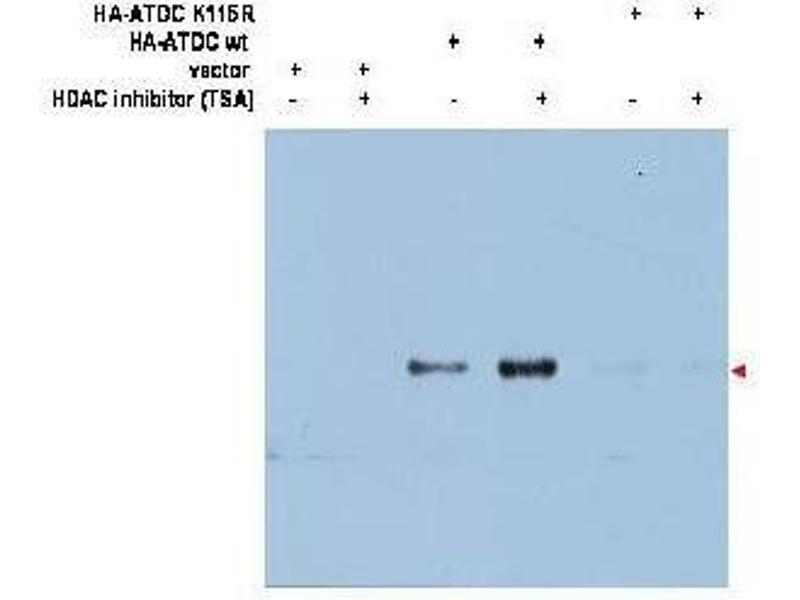 Application Note: This affinity purified antibody has been tested for use in ELISA and western blotting. Specific conditions for reactivity and detection of ATDC Ac-K116 should be optimized by the end user. Expect a band approximately ~66 kDa in size corresponding to ATDC Ac-K116 by western blotting in the appropriate cell lysate or extract.